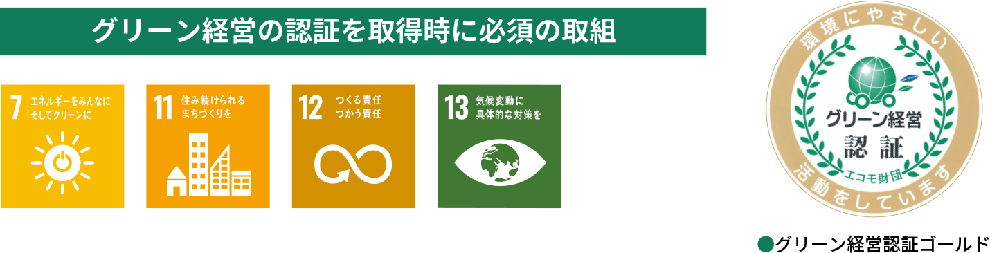 井ノ瀬運送では、2010年より環境改善に向けた自主的で継続的な環境保全活動を行うことができる、グリーン経営*1に取り組み、今年で13年目になります。グリーン経営認証は営業所ごとの認証となっており、取得後10年を経過すると、ロゴマークが「緑」から「ゴールド」に色が替わり、「永年表彰」をいただくことができます。既に半数の営業所が「ゴールド」になっています。この認証は容易に取得できるものではなく、認証機関が設定した認証基準をクリアしなければなりません。